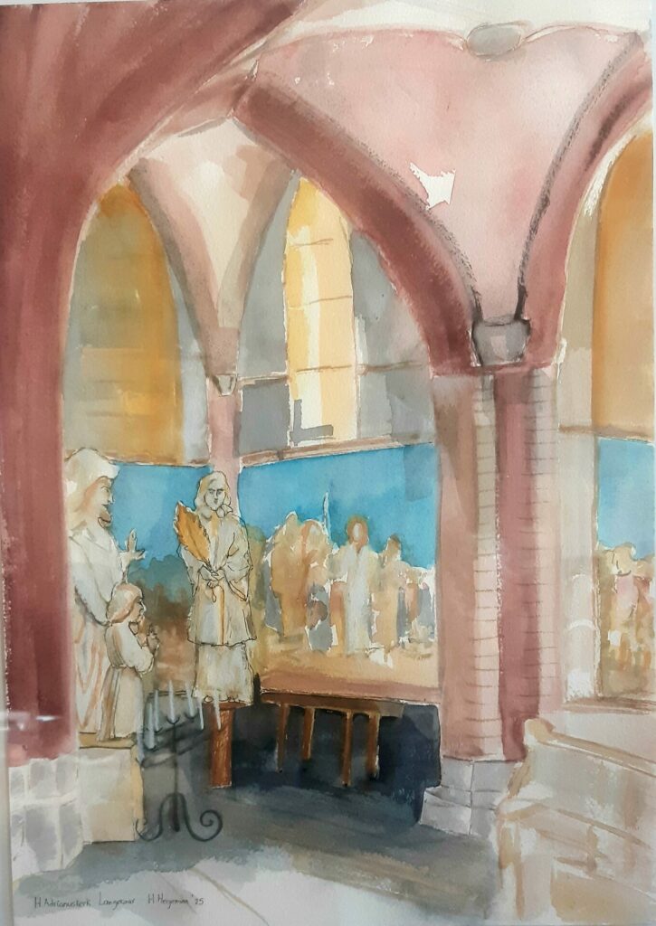Als thema koos ik het kruispunt van twee beuken van deze kerk. Vanwege de drie ontroerende beelden, en het licht door de ramen. Daaronder en waarachter gaan de wandschilderingen de hoeken om. Alle wanden langs, van deze grote en rijkgedecoreerde kerk. Vanaf 26 oktober hangt de reizende expositie van de kerkschilders in de Martinuskerk te Noorden. Op zondagen tijdens de vieringen, en op afspraak open.