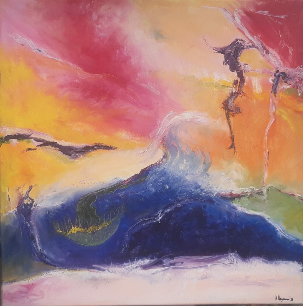 30 juni 2025 Deep dancing light in the sea Techniek olieverf Afmetingen 70 x 70 cm Jaartal 2025 Prijs €275 euro Een nieuw abstract werk van zeepaardjes en kwalachtige wezens in de diepte, met het licht dat van boven deze diepte in danst.