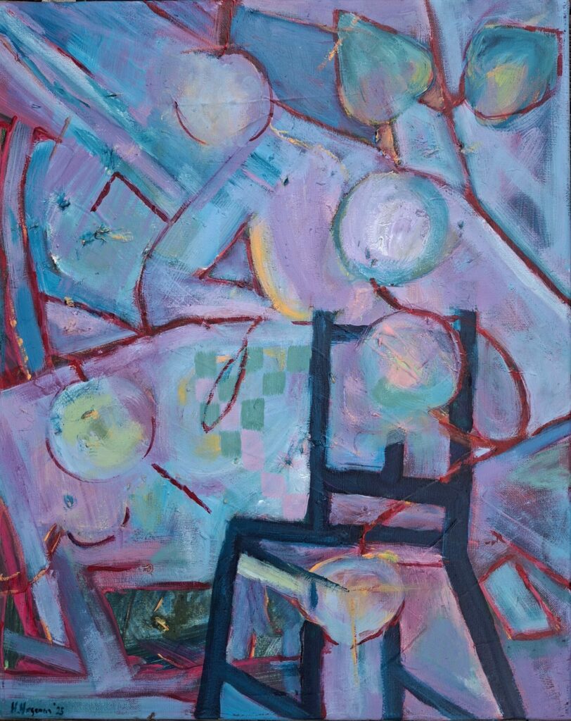 Een abstracte verbeelding waarbij de groei van gebladerte, en de tussenruimtes met elkaar metamorfose spelen, elkaar opzoeken, rondom een stoel op het water. Beeld van “Ken je mij?” De kleuren bevallen mij heel goed, maar het was een zoeken naar nieuwe ruimte temidden van alle emoties. Soms zit je daar immers even middenin.