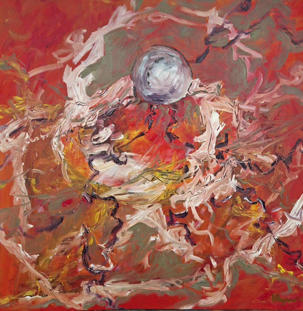 Vrijheid en grenzen. Ik koos voor vrijheid binnen de grenzen van de omlijsting. En de kleuren houden zich niet aan de hoeken maar gaan daaroverheen. En er is slechts dat begrensde bolletje hoog middenin. Maar alles beweegt daaruit de vrijheid in. Ik schreef het volgende gedicht bij dit doek:
