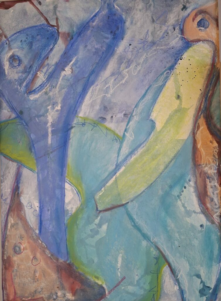 In aquarel ontstonden een aantal fluide vormen, als een soort onderwater wezens. Ze deinen van links naar rechts het beeld door. Met pastels voegde ik wat vrolijk getinte koppetjes toe aan deze wezens. En juist toen kwam het volgende acapella gezongen lied van Milckmusic, op Instagram, op mijn pad: